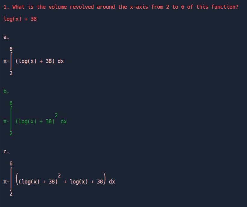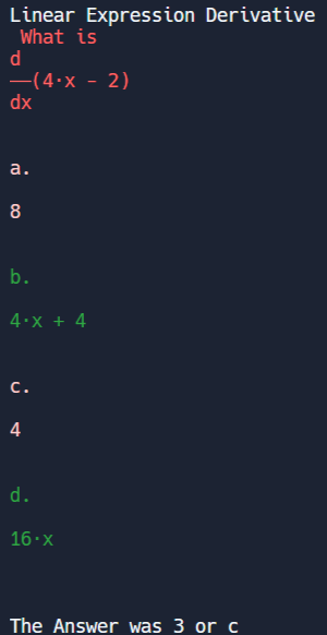 I basically created a program that could find the derivatives and integrals of most functions used in AP Calculus AB and BC. I programmed in several different types of function classes: for example polynomials, sin, cos, tan, ln, exponentials, and constants (I used them in my code as functions cause it was easier that way) I also coded the calculus rules that needed to be followed in order to find the derivative or integrals of these functions. Once I coded these basics, I moved on to more complicated calculus rules like the product, chain, and quotient rules (along with their integral counterparts). Once I had all the calculus rules working, I moved on to the quiz part of the project. I decided that each type of question would be multiple choice and I set out on creating realistic incorrect answers for all the calc rules. This in retrospect was the longest part of the project because I had to put a lot of thought into what students could make mistakes on. After this, I began generating the actual questions which was also difficult. I had to constrain the things that were generated to only have things that could be solved by an AP Calc student (even though I only taught my program AP Calculus it generated problems that were way to long like with multiple chain or quotient rule uses which isn’t realistic) In the end, I was able to create 19 different question types (you can look through the code to see them) and a quiz program using python to ask these questions as well.