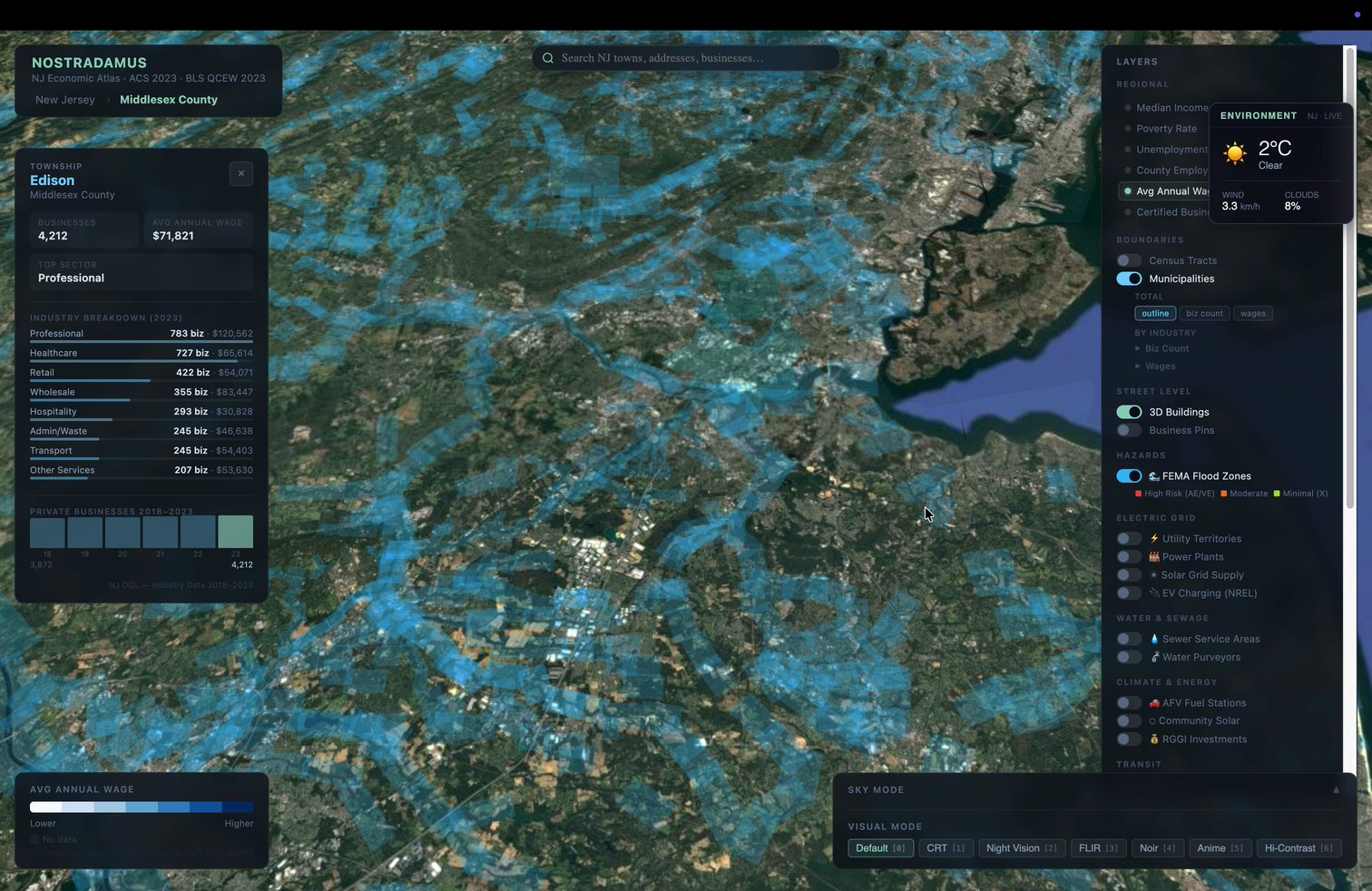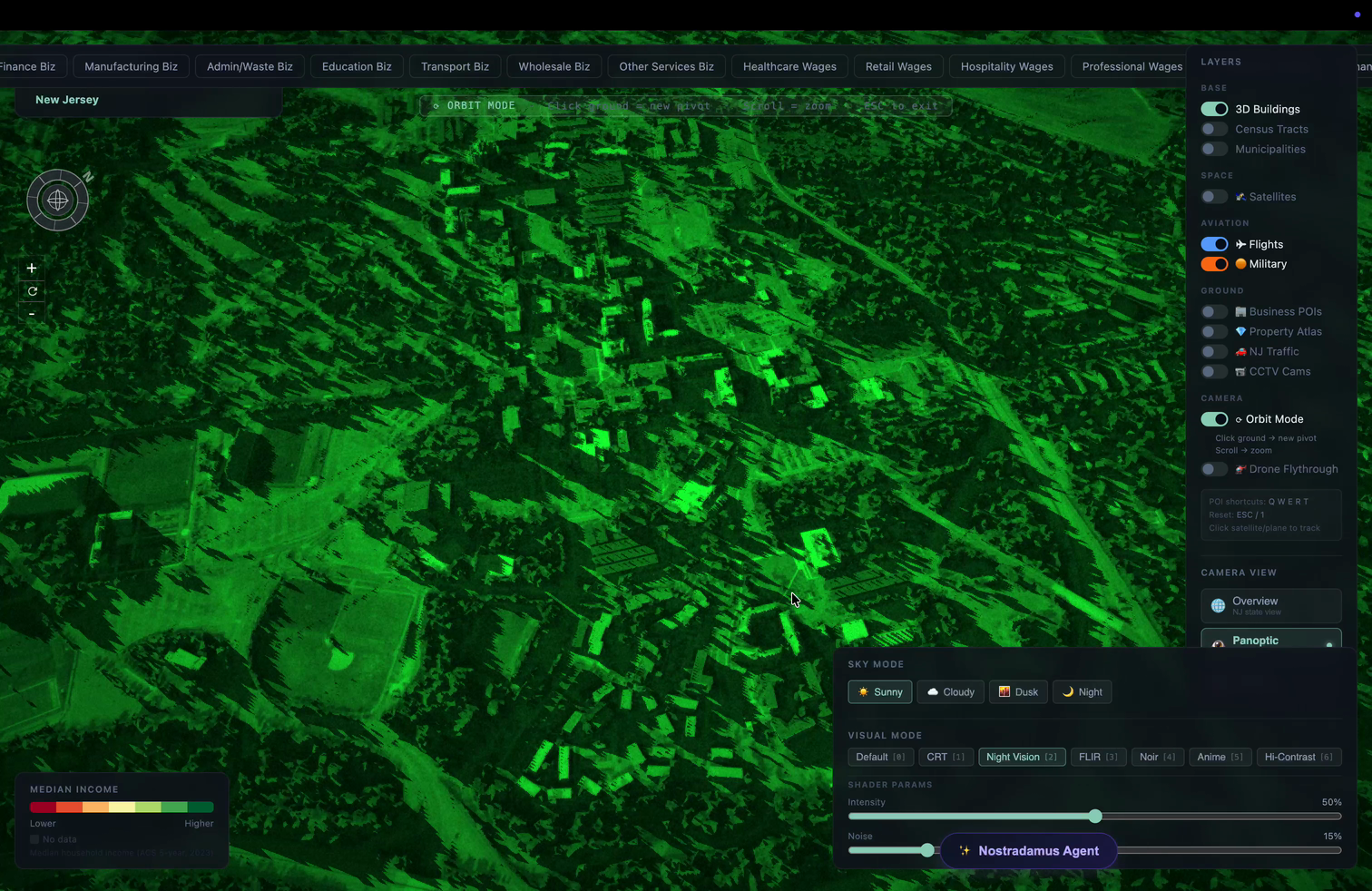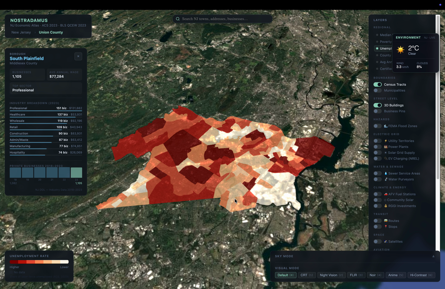 Most mapping tools show you where things are. NOSTRADAMUS shows you what’s happening—and what it means. It’s a real-time geospatial intelligence platform built for New Jersey that fuses 3D city simulation, live aviation tracking, and deep economic data into a single interactive environment. Whether you’re analyzing unemployment patterns across counties, tracing commercial flight paths over a neighborhood, or exploring a city block in Night Vision mode, NOSTRADAMUS makes the invisible visible.