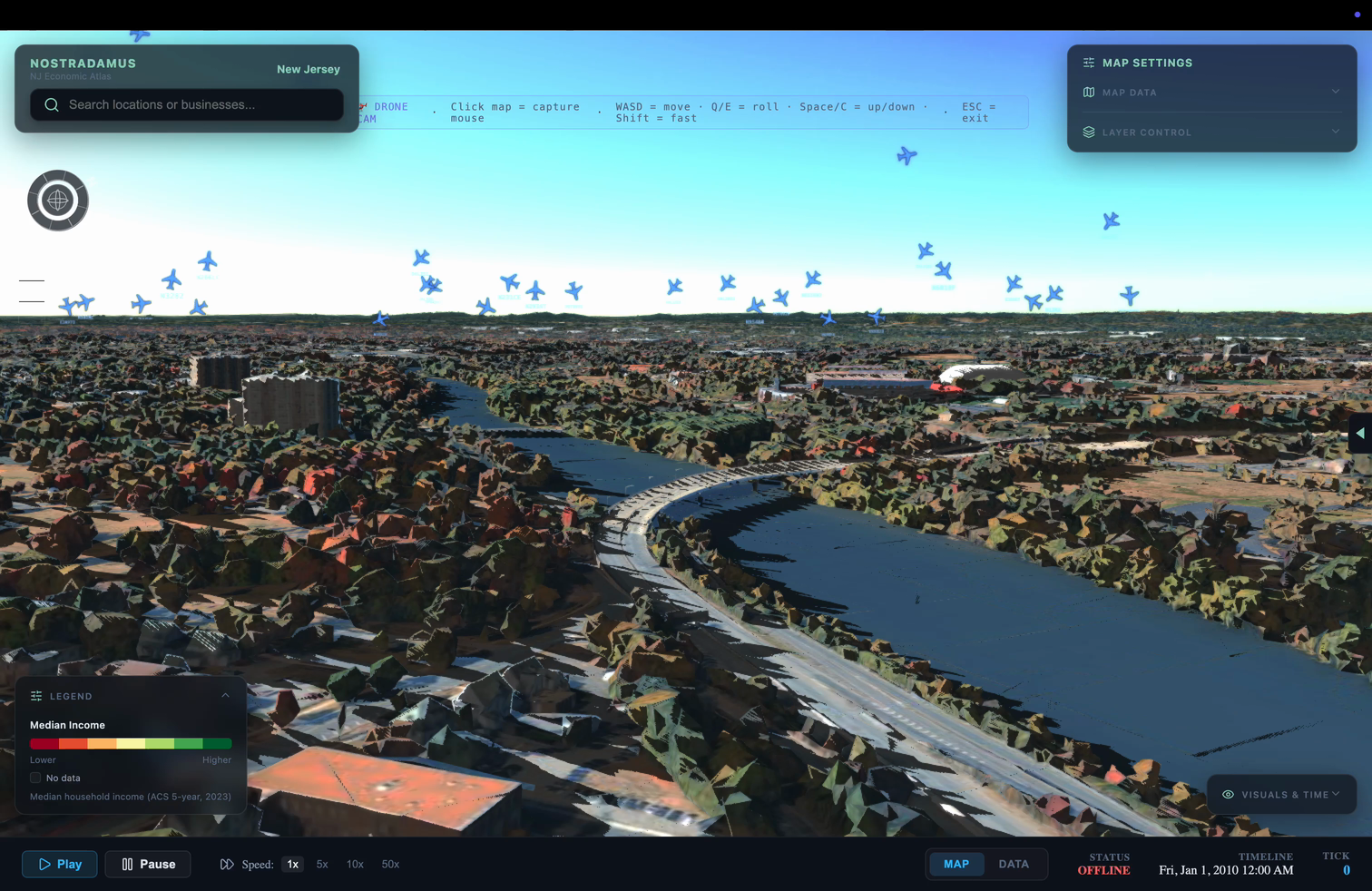 The 3D view renders New Jersey with full building extrusion, color-coded by Median Household Income (ACS data). Live commercial and military flights are overlaid as animated icons using real-time aviation data. A Drone Flythrough camera mode lets you navigate the environment with full 6-degrees-of-freedom controls (WASD + Q/E + Space/C), and a time simulation engine lets you scrub through historical periods starting from 2010 at speeds up to 50×.