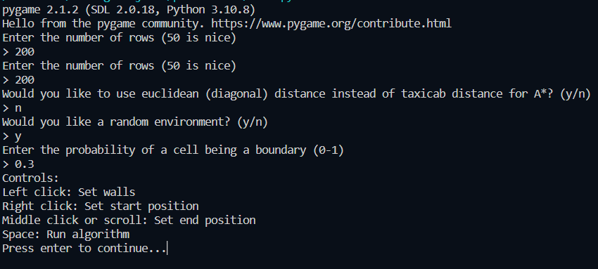 Once you run the program, you will see a bunch of questions asking how to set up the environment. You can choose to create a random environment or create your own. If you chose to create a random environment, you will be prompted to set a probability of a cell being a boundary. A number between 0.3 and 0.4 is usually good.